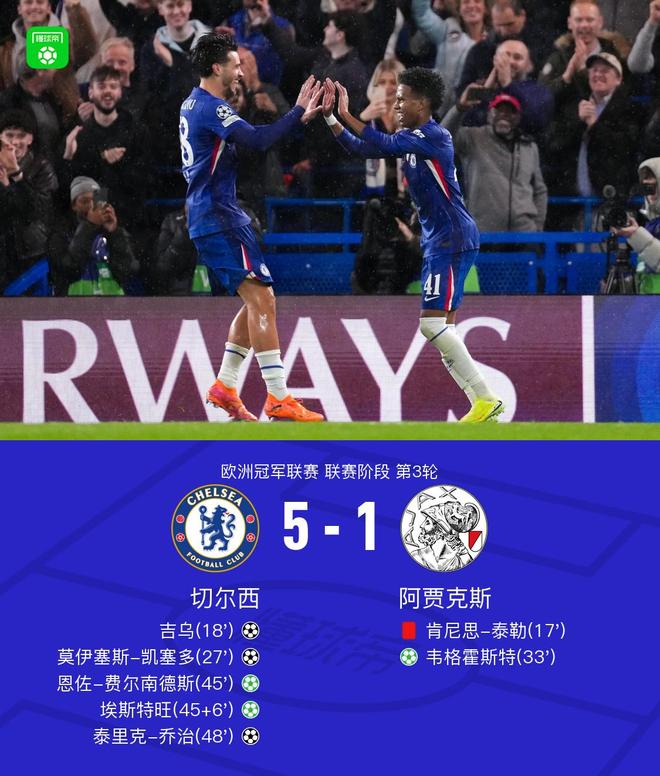 北京时间10月23日,切尔西在欧冠第三轮比赛中对阵阿贾克斯。泰勒在上半场因飞铲被罚下场,阿贾克斯则以 10 人回应。福法纳助攻,玖进球。凯塞多远射,皮球偏入球网。阿达拉比奥尤得分,韦格霍斯特罚球。随后韦格霍斯特力压恩佐得分,恩佐罚球命中。中场休息前,蓝军再次赢得点球,由埃斯特万主罚。下半场乔治进球。全场比赛结束,切尔西5-1击败阿贾克斯。决战第18分钟,福法纳的助攻和吉奥的进球帮助切尔西1-0领先。第17分钟,切尔西进球前,肯尼思·泰勒因飞铲被红牌罚下。第26分钟,凯塞多远射,皮球击中阿贾克斯。一名后卫将球偏转入网,切尔西2-0获胜。第33分钟,阿达拉比奥尤踩人,主罚点球。韦格霍斯特主罚点球。阿贾克斯1-2。韦格霍斯特广告第45分钟再得一分。恩佐主罚点球。切尔西 3-1。第45+5分钟,切尔西再获点球,埃斯特班主罚命中,切尔西4-1。第48分钟被挡出。乔治射门偏出,切尔西5-1获胜。两支球队的球员都在激动人心的时刻进入了比赛。比赛立即开始。第13分钟,切尔西传球精准,吉奥的射门被门将挡出。第18分钟,福法纳助攻,吉奥进球,切尔西1-0领先。切尔西进球前 17 分钟,第 23 分钟肯尼思·泰勒因飞铲被红牌罚下。由于一名球员缺阵,阿贾克斯提前更换了格洛克。第26分钟,凯塞多远射。球从阿贾克斯后卫身上弹开并入网。切尔西2-0。第33分钟,阿达拉比奥尤踩人,判罚点球。韦格霍斯特被处以死刑。破门,阿贾克斯1-2。第45分钟,韦格霍斯特进球,N.Tso主罚点球,切尔西3-1领先。切尔西在第45分钟和第5分钟再获点球,埃斯特班主罚命中,切尔西4-1,但第48分钟点球偏出。乔治射门偏出,切尔西5-1获胜。第56分钟,埃斯特班铲倒对手吃到黄牌。第66分钟,切尔西做出换人,沃尔什替补登场。第70分钟,乔治传球,埃斯特班射门偏出。第80分钟,乔治闪身斜射,被后卫挡出。第83分钟,乔治传球后埃斯特班的空中射门险些偏出。第90+4分钟,沃尔什将球送入网内,但门将帕斯韦尔没收。球队阵容技术统计
