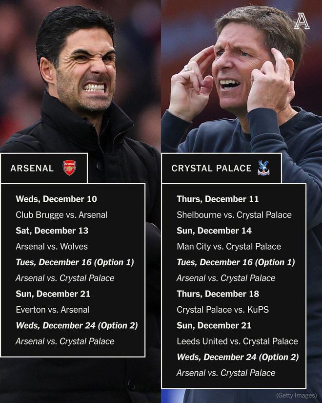 周四凌晨,阿森纳在联赛杯第四轮比赛中以2-0击败布莱顿,四分之一决赛将对阵水晶宫。据统计,水晶宫将于12月11日前往都柏林在欧国联中迎战爱尔兰球队谢尔本,这意味着水晶宫与曼城的英超比赛将推迟至12月14日进行。水晶宫随后将在12月18日主场对阵芬兰杯,然后在12月21日对阵利兹联。同时,阿森纳将以客场身份对阵俱乐部。他们将在12月10日对阵布鲁日,然后在12月13日主场迎战狼队,然后在12月21日对阵埃弗顿。因此,阿森纳没有周中的比赛,但定于周四对阵水晶宫的比赛。比赛日期很可能是12月16日(这意味着水晶宫将在八天内打四场比赛)或平安夜,但英超联赛尚未确定转播安排节礼日之后在英国的活动可能会使事情变得复杂。这场比赛必须在半决赛之前进行。半决赛首回合定于1月12日这一周进行,但没有时间调整联赛杯四分之一决赛,因为两队将在1月10日至11日左右进行足总杯第三轮比赛。平安夜的比赛将会是一场痛苦的比赛。圣诞节前一天,公共交通服务将在晚间开始减少,导致球迷难以离开球场。此外,由于 12 月 24 日是工作日,因此比赛需要安排在较晚的开始时间。然而,如果比赛日期定在12月16日,水晶宫将需要在八天内打四场比赛,五天内打三场比赛。这对于每个参与者,尤其是玩家来说,都将是一个巨大的挑战。 【咪咕独家观看英超联赛】