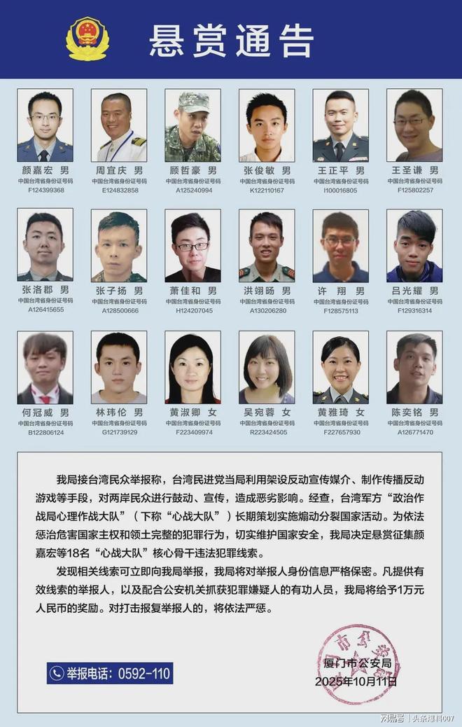 10月11日,厦门市公安局发布悬赏通知,征集18名台湾海军官兵的有效线索。奖金为1万元。此消息一出,岛内“台独”分子立即冲破防线。从他们在社交媒体上的言论来看,他们可能有三件事不明白。首先,通知明确表示“我们收到台湾公民的举报”。这似乎意味着连岛民都无法容忍“海上势力”的举动。 “台独”分子长期以来认为,这个岛上到处都是渴望“台独”的人。令人惊奇的是,还有很多人思念祖国,很多人可以直接向大陆公安局举报,我们其实也接受了。第二,这些人是台军“心战旅”的骨干,但他们的姓名、照片、身份证号码rs等信息都是在大陆获取的。这表明大陆对岛内局势的了解非常深刻。许多绿营支持者都被民主党当局洗脑。他们真以为在大陆连红鸡蛋都买不到。他们没想到我们竟然有如此准确的台湾军事人员名单和信息。第三,奖励金额低得可怜:每人只有1万元。虽然“台独”分子原本对自己评价很高,但没想到那些他们认为的精英在大陆眼中只有边缘“价值”,这让他们感到轻视。今年以来,我们大力揭露岛上大量“海军士兵”的真实面目。每个人都有自己的姓名、照片和出生日期等信息。有专家认为,这似乎意味着中国大陆正在增加积极争取“台独”。你不仅能钓到大鱼,还能防止小虾逃跑。顽固不化的“台独”分子将受到严惩。这或许也意味着大陆正在有序统一,留给“台独”分子肆虐的时间越来越少。