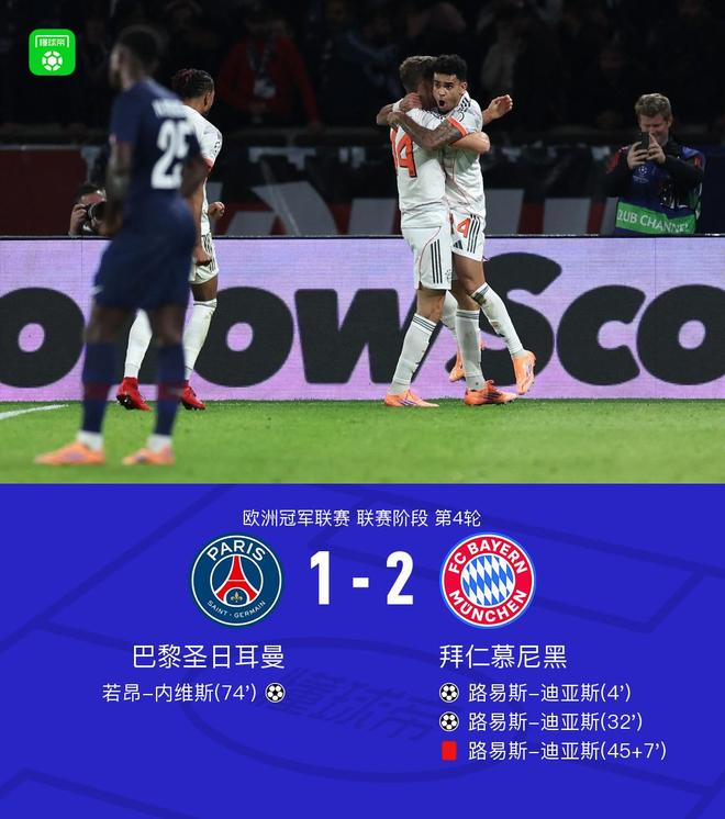 北京时间11月5日,巴黎圣日耳曼队在欧冠联赛第四轮比赛中迎战拜仁慕尼黑队。巴黎圣日耳曼队的琼·内维斯进球。路易斯·迪亚斯为拜仁慕尼黑梅开二度。最终结果巴黎圣日尔曼1-2拜仁。在重要事件的第4分钟,奥利塞救了自己。随后迪亚兹凌空抽射破门。拜仁首场比赛以1-0轻松战胜巴黎!第32分钟,迪亚斯抢断马尔基尼奥斯中路破门。拜仁2-0巴黎!第45分钟第3分钟,迪亚兹从背后击倒阿什拉夫。裁判在查看VAR的同时将球罚下。第74分钟,若奥·内维斯扫射破门,锁定胜局。巴黎1-2拜仁。两支球队的球员都参加了比赛。比赛马上就要开始了。第4分钟,奥里斯单刀扑救。随后迪亚兹凌空抽射破门。拜仁首场比赛以1-0轻松战胜巴黎!第七分钟,镜头转向替补席,维拉蒂在场边观看。看台。第15分钟,法比安·鲁伊斯的射门击中了队友KK7,出了底线。第19分钟,帕夫洛维奇远射,皮球击中底线外的帕乔。第25分钟,登贝莱第27分钟进球,但越位在先。第27分钟,登贝莱疑似受伤,坚持不住。李冈伦替补出场。第32分钟,迪亚斯抢断马尔基尼奥斯中路破门。拜仁2-0巴黎!第33分钟,格纳布里几乎正对球门的射门击中立柱反弹。第30分钟,巴科拉单刀射门,但被诺伊尔挡出。 43分钟,并不长。塔踩了KK7。第45分钟+2,格纳布里脚后跟传球,基米希射门偏出。 45+3 第50分钟,迪亚斯从背后铲倒阿什拉夫,主裁判查看VAR后将其罚下。下半场第46分钟,拜仁换人,比绍夫替补上场。在第50米上半场,李冈伦开出角球,KK7头球攻门高出球门。第56分钟,门德斯送出传球,巴科拉射门。我把他淘汰了。第67分钟,KK7低射,诺伊尔稳稳将球扑出。第68分钟,巴黎做出改变。贡萨洛·拉莫斯和内维斯被放在替补席上。第69分钟,剑锋尚幼。维西尼亚的远射被诺伊尔挡出。第74分钟,若奥·内维斯扫射破门,锁定胜局。巴黎-拜仁1-2 第77分钟,维西尼亚远射,诺伊尔再次将球扑出。第79分钟,埃梅里接李冈伦直塞后射门被诺伊尔挡出。第82分钟,内维斯接李冈伦传球头球稍稍偏出球门。拜仁第89分钟做出换人,被凯恩换下。技术统计